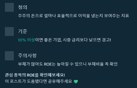 이제 ROE가 어떤 숫자인지 확실히 감이 오시나요? 오늘 배운 내용을 바탕으로 여러분의 관심 종목 ROE를 한번 확인해 보세요. 혹시 마이너스거나 1%대라면... 다시 한번 고민해 보시는 게 좋겠죠? 😅