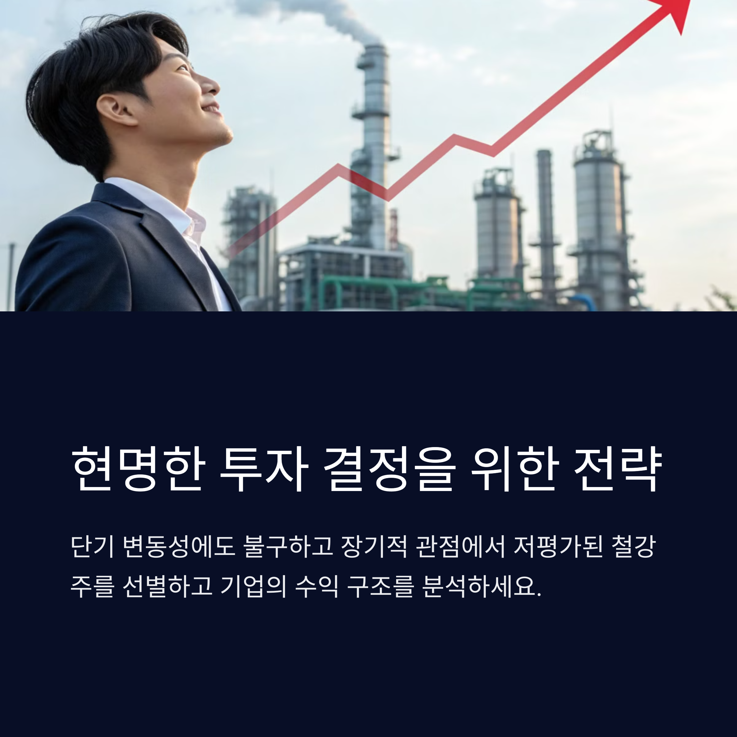 단기적인 하락 가능성을 염두에 두고, 장기적인 관점에서 저평가된 철강주를 매수하는 전략이 필요합니다. 또한 원자재 가격 변동성과 글로벌 수요를 주의 깊게 살펴보아야 합니다.