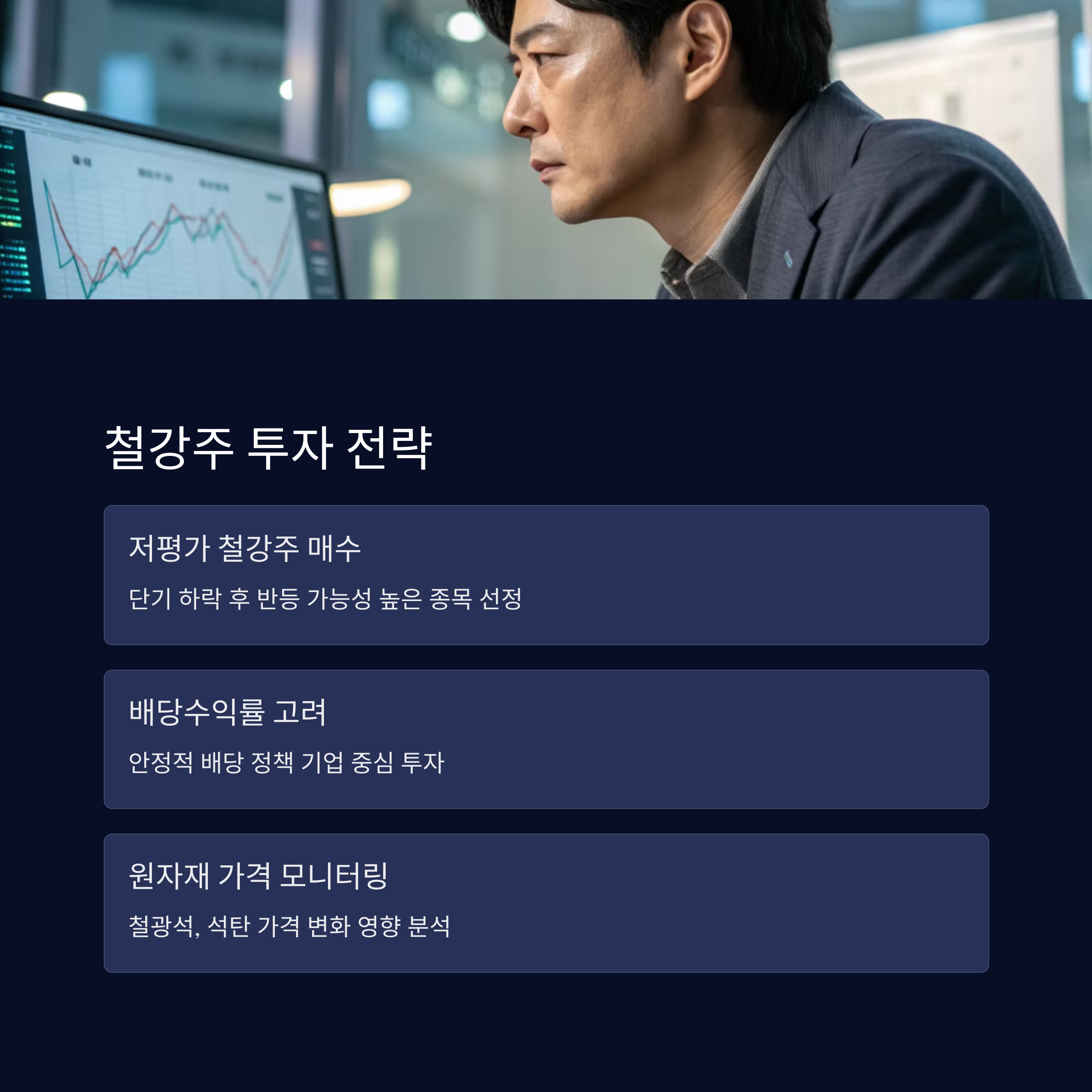 단기적인 하락 가능성을 염두에 두고, 장기적인 관점에서 저평가된 철강주를 매수하는 전략이 필요합니다. 또한 원자재 가격 변동성과 글로벌 수요를 주의 깊게 살펴보아야 합니다.