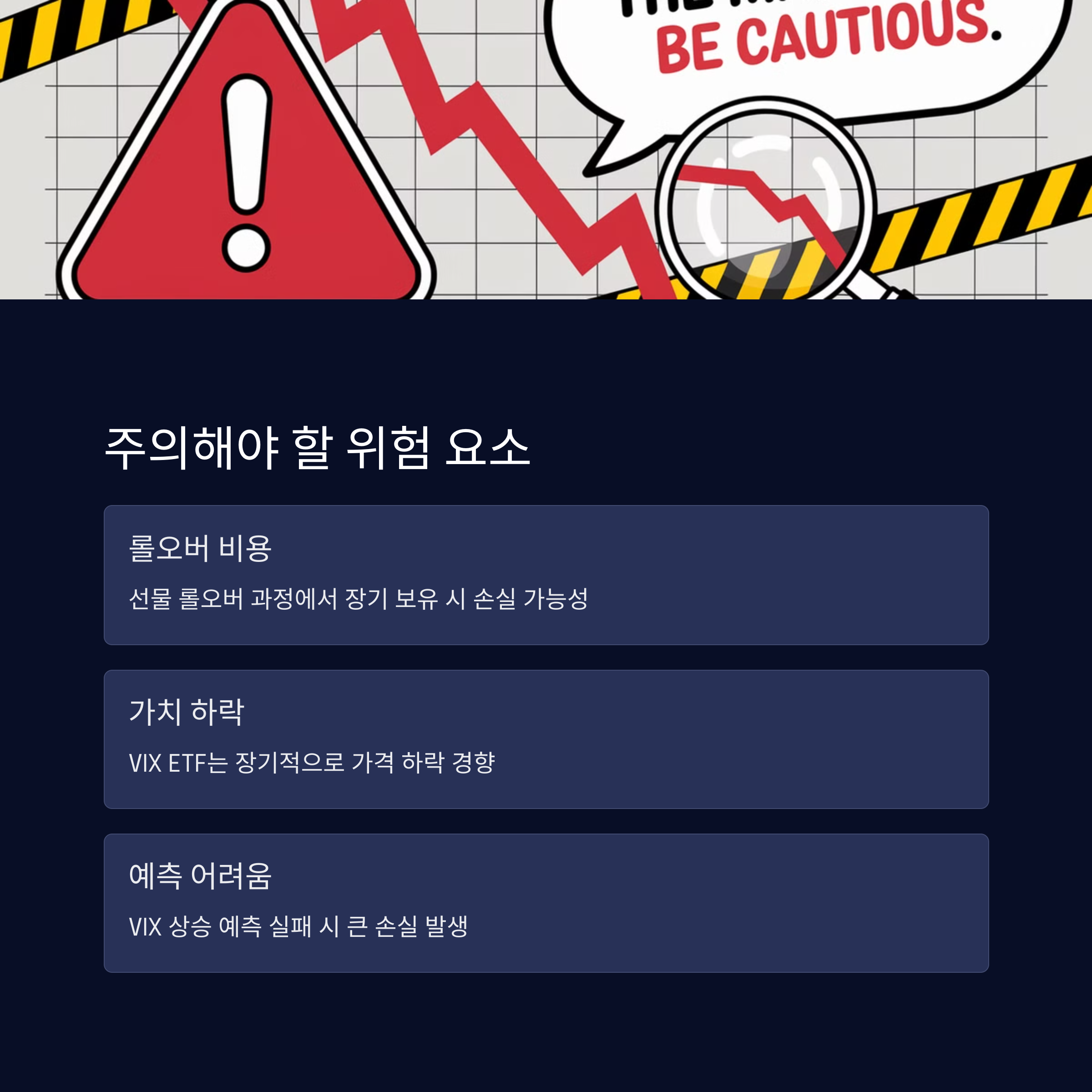 | 롤오버 비용 | VIX 선물 롤오버 과정에서 비용이 발생하여 장기 보유 시 손실 가능성 증가 |