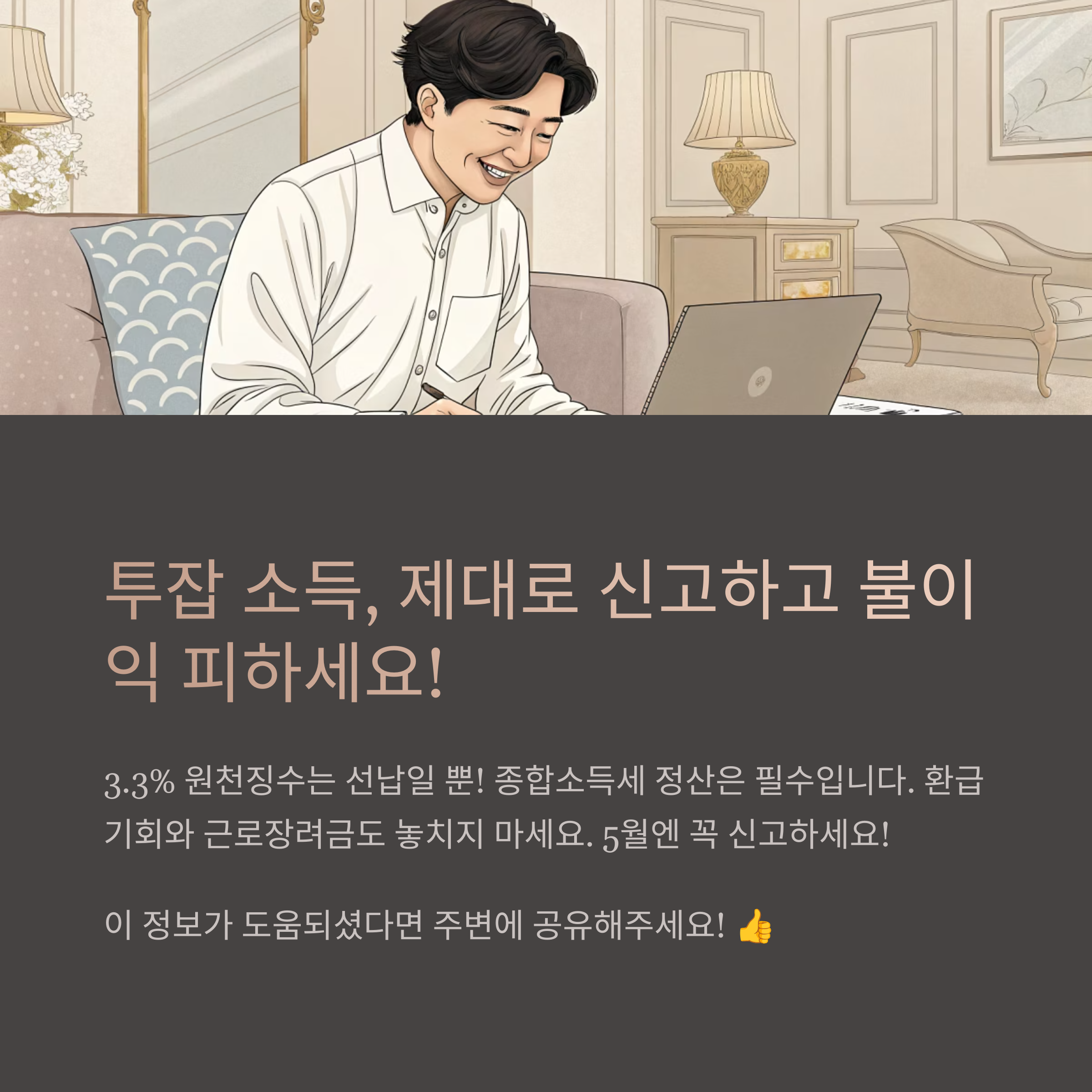 3.3%는 소득세와 주민세를 간단히 미리 낸 것일 뿐, 연간 소득 전체를 기준으로 최종 세금을 정산해야 합니다. 환급 대상이 될 수 있으니 반드시 신고하세요.