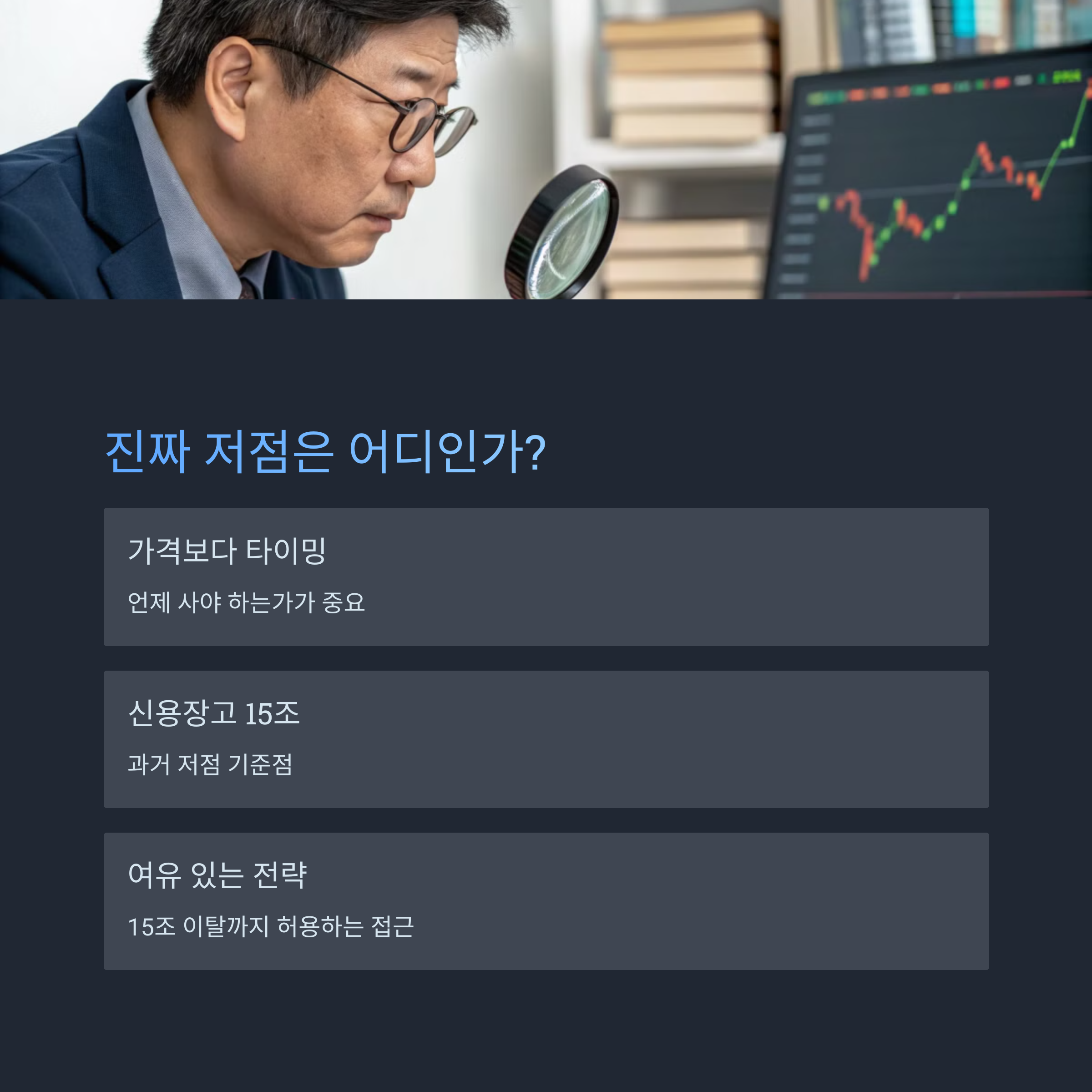 지금은 가격이 아니라 타이밍의 문제입니다. 필자는 ‘신용장고 15조’라는 수치를 기준점으로 보고 있습니다.