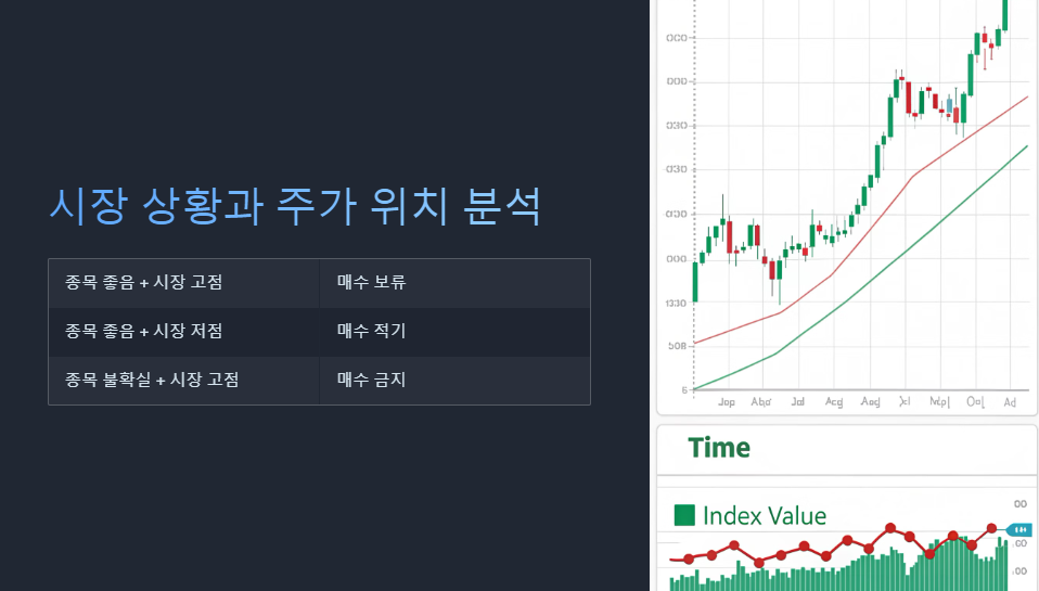 | 종목 좋음 + 시장 저점 | 매수 적기 |