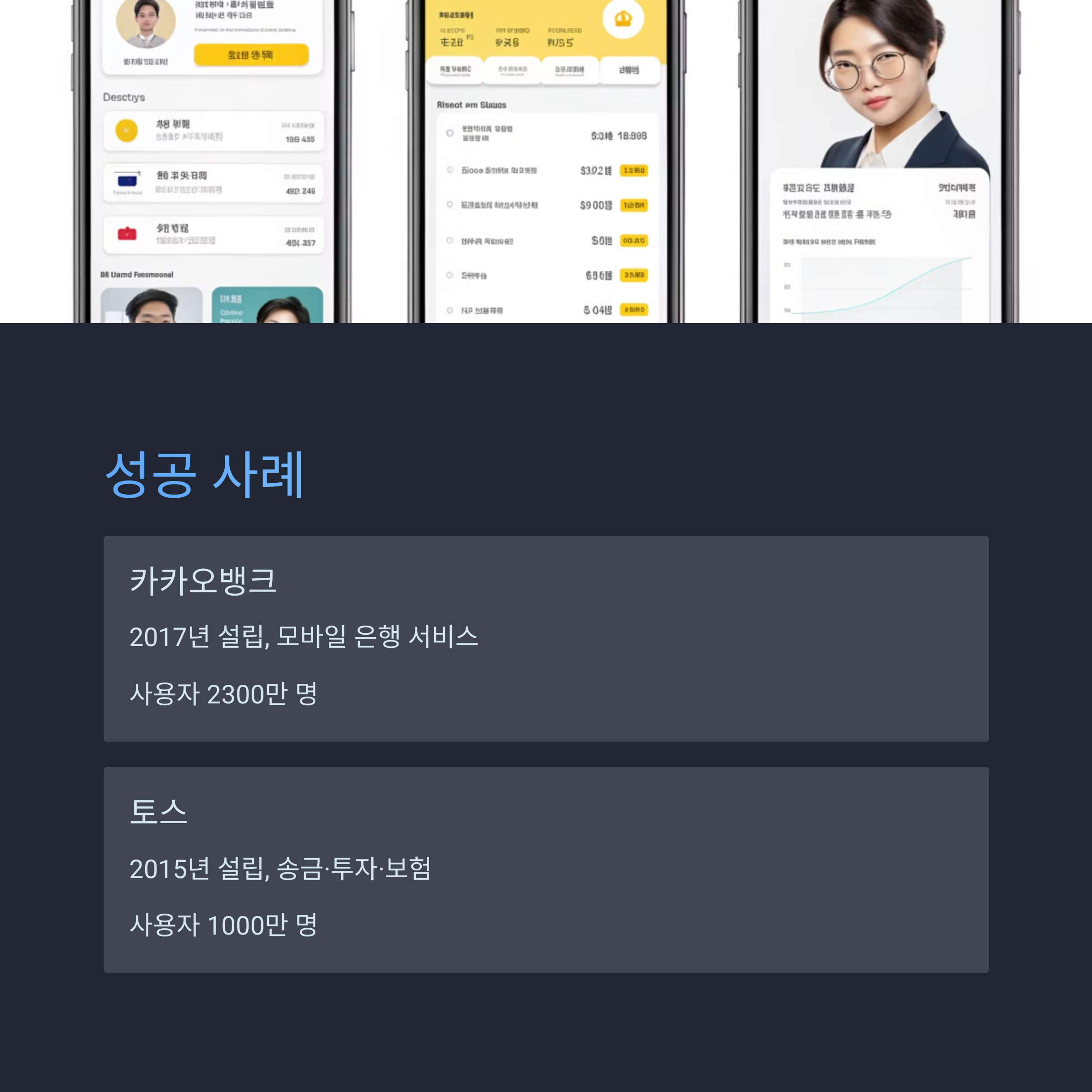 | 카카오뱅크 | 2017년 | 모바일 은행, 대출, 결제 | 2300만 명 |