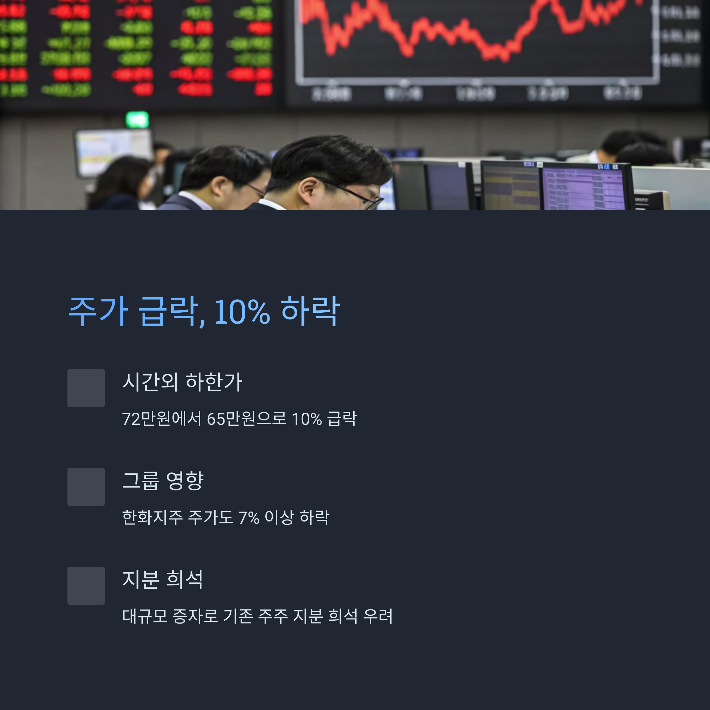 이는 10% 가까운 급락을 의미합니다. 한화그룹의 지주사인 한화의 주가도 7% 이상 하락하며 영향을 받았습니다.