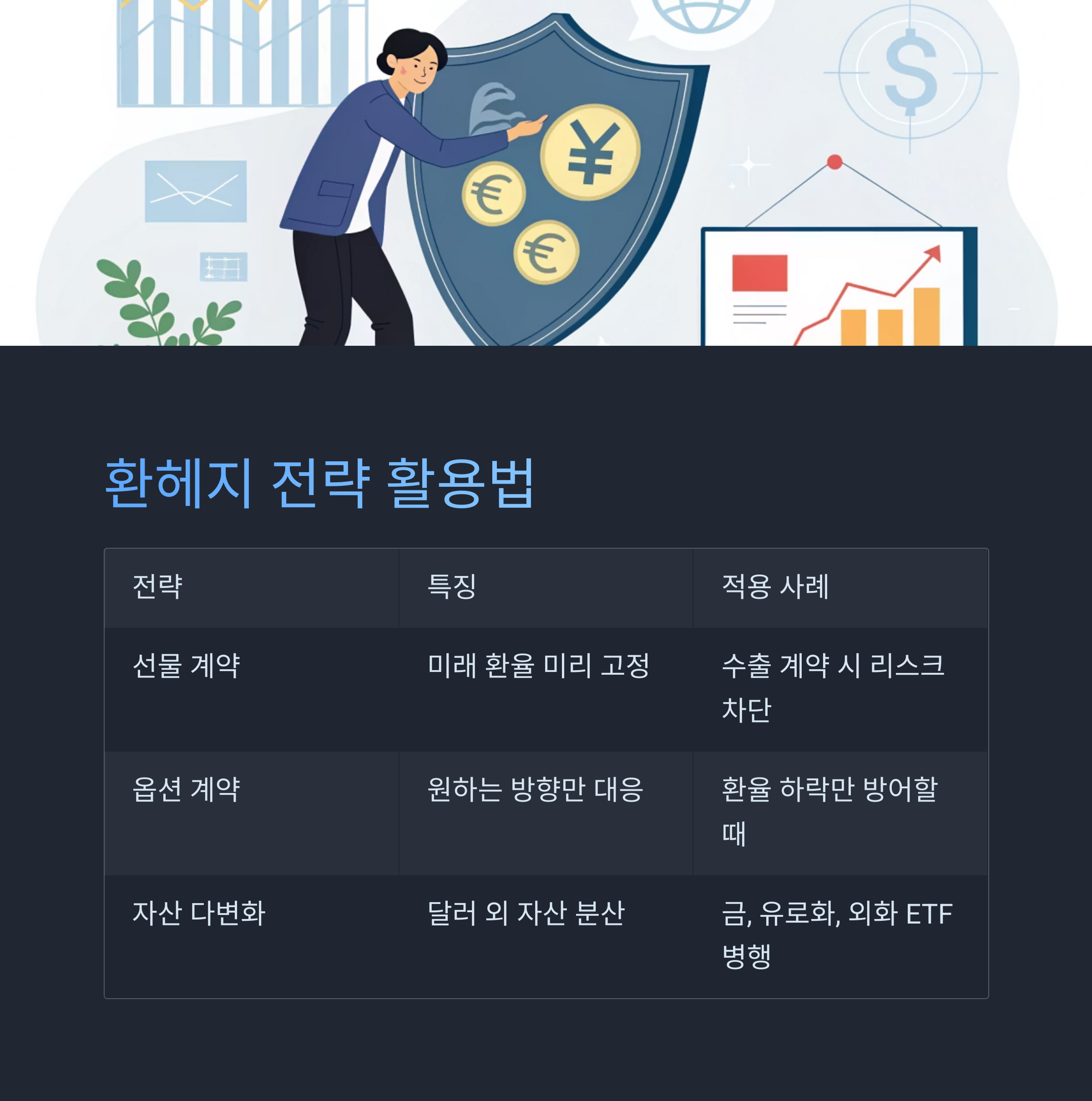 | 선물 계약 | 미래의 환율을 미리 고정 | 수출 계약 시 환율 리스크 차단 |