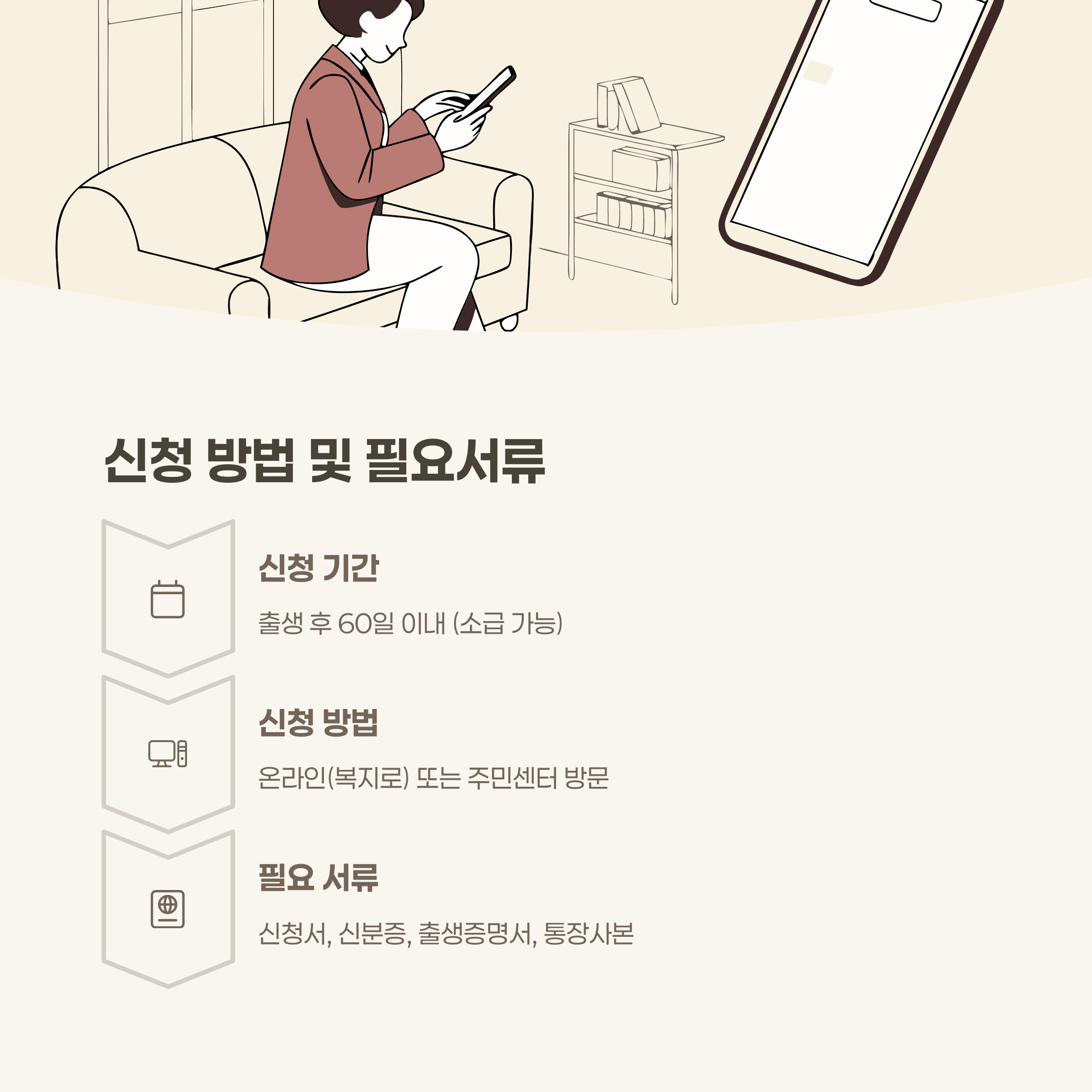 | 필요 서류 | 신청서, 신분증, 출생증명서, 통장 사본 등 |