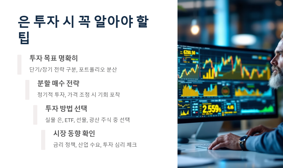 처음에는 은 ETF나 소량의 실물 은을 구매하면서 시장 흐름을 익히는 것이 좋습니다. 또한, 단기 변동성이 크므로 분할 매수 전략을 활용하세요!
