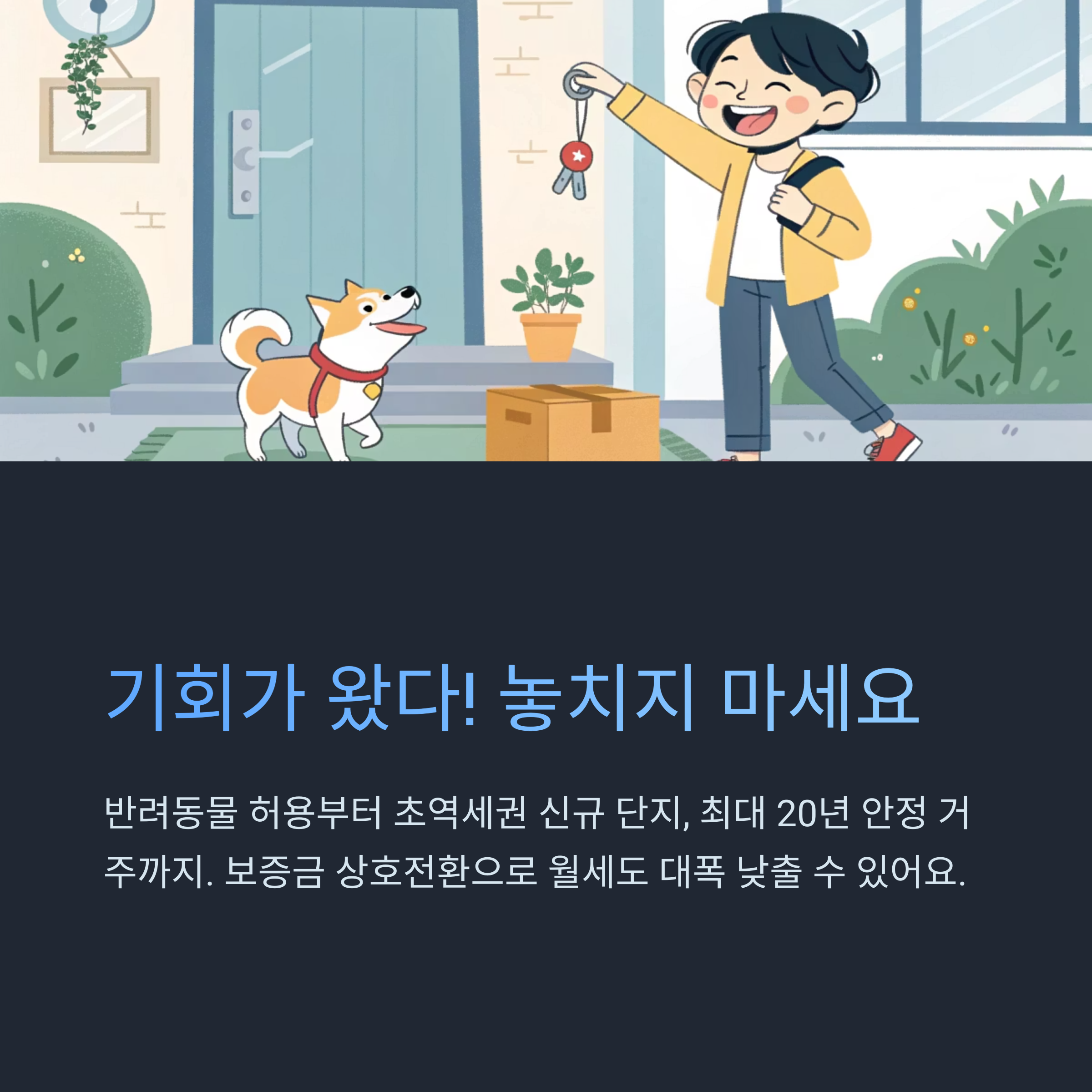 반려동물 허용이라는 획기적인 변화부터 초역세권 신규 단지, 최대 20년 안정 거주까지.