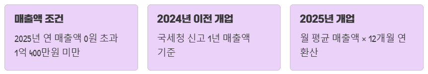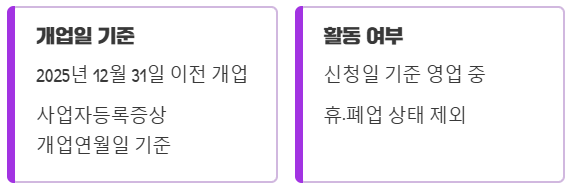 • 개업일 기준: 2025년 12월 31일 이전 (사업자등록증상 개업연월일 기준)
