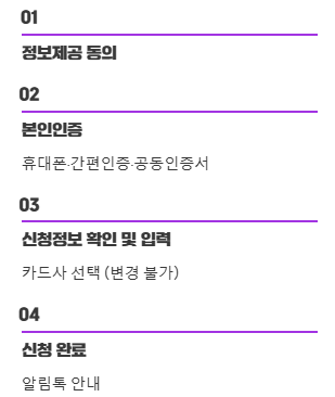 💡 팁: 신청 시 사용할 카드사를 신중하게 선택해야 해요. 한 번 등록하면 변경이 불가능하다고 하니, 주 거래 카드나 바우처 사용이 용이한 카드를 선택하는 게 좋겠죠? 그리고 혹시 선택한 카드사의 카드가 없다면 미리 발급받아두시는 걸 추천합니다.