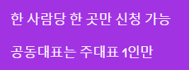 이 부분이 좀 헷갈릴 수 있는데요, 한 사람이 여러 사업체를 운영하더라도 딱 한 곳만 신청 가능합니다. 공동대표가 있는 사업체는 주대표 1인만 신청할 수 있고요.