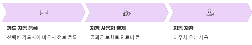 지원 대상으로 선정되면, 신청 시 선택한 카드사에 바우처 정보가 자동 등록됩니다. 별도의 증빙 자료 제출 없이 등록된 카드로 지정된 사용처 항목을 결제하면, 바우처가 자동으로 먼저 차감되는 방식이에요. 아주 편리하죠?