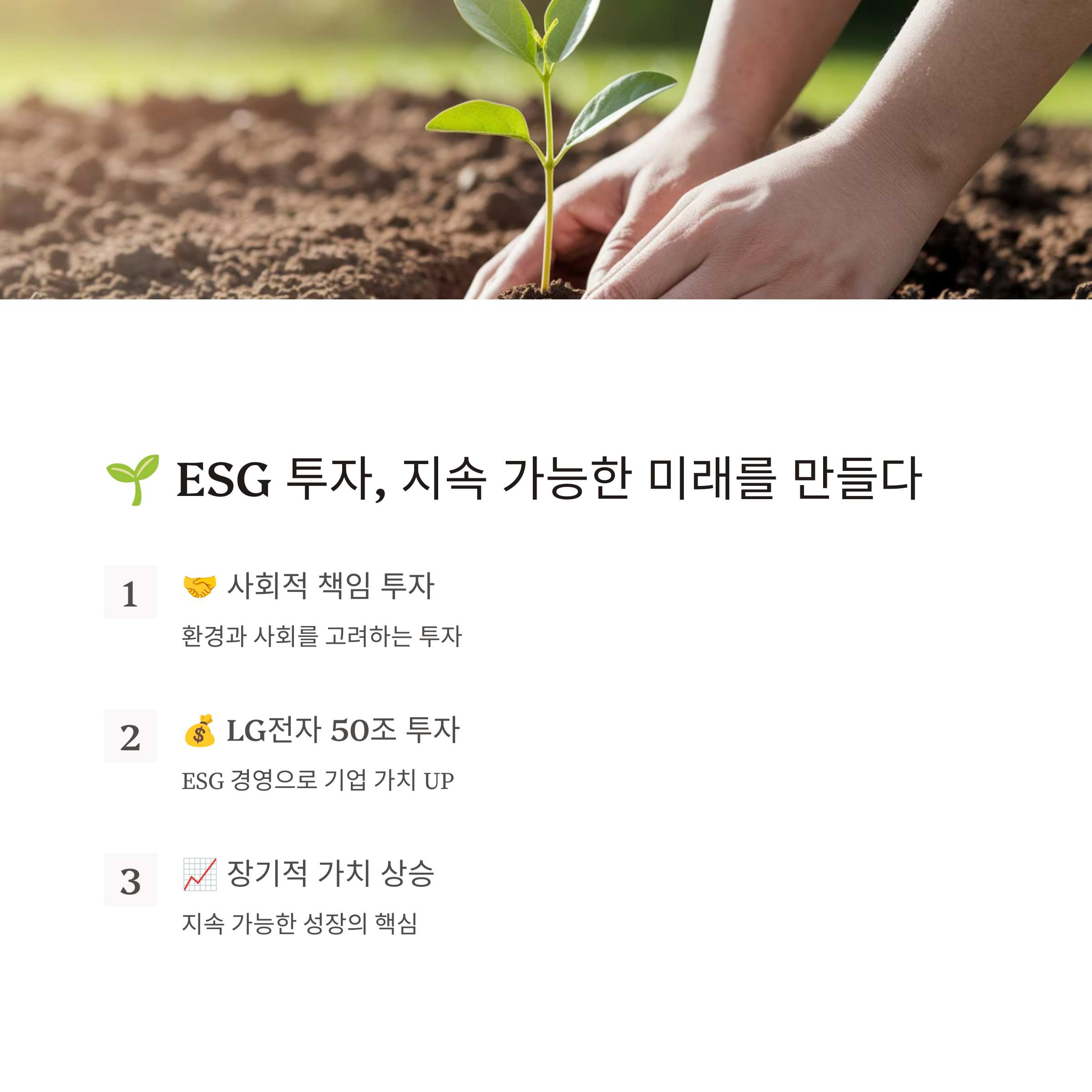 ESG 투자는 이제 선택이 아닌 필수가 되고 있습니다. 지속 가능성을 고려하는 기업들은 정부 지원과 사회적 신뢰를 얻어 장기적으로 더 안정적인 성장을 할 가능성이 높습니다. 탄소 중립, 친환경 에너지, 사회적 책임 경영을 실천하는 기업에 투자하는 것은 미래 시장에서 큰 가치를 가질 것입니다.