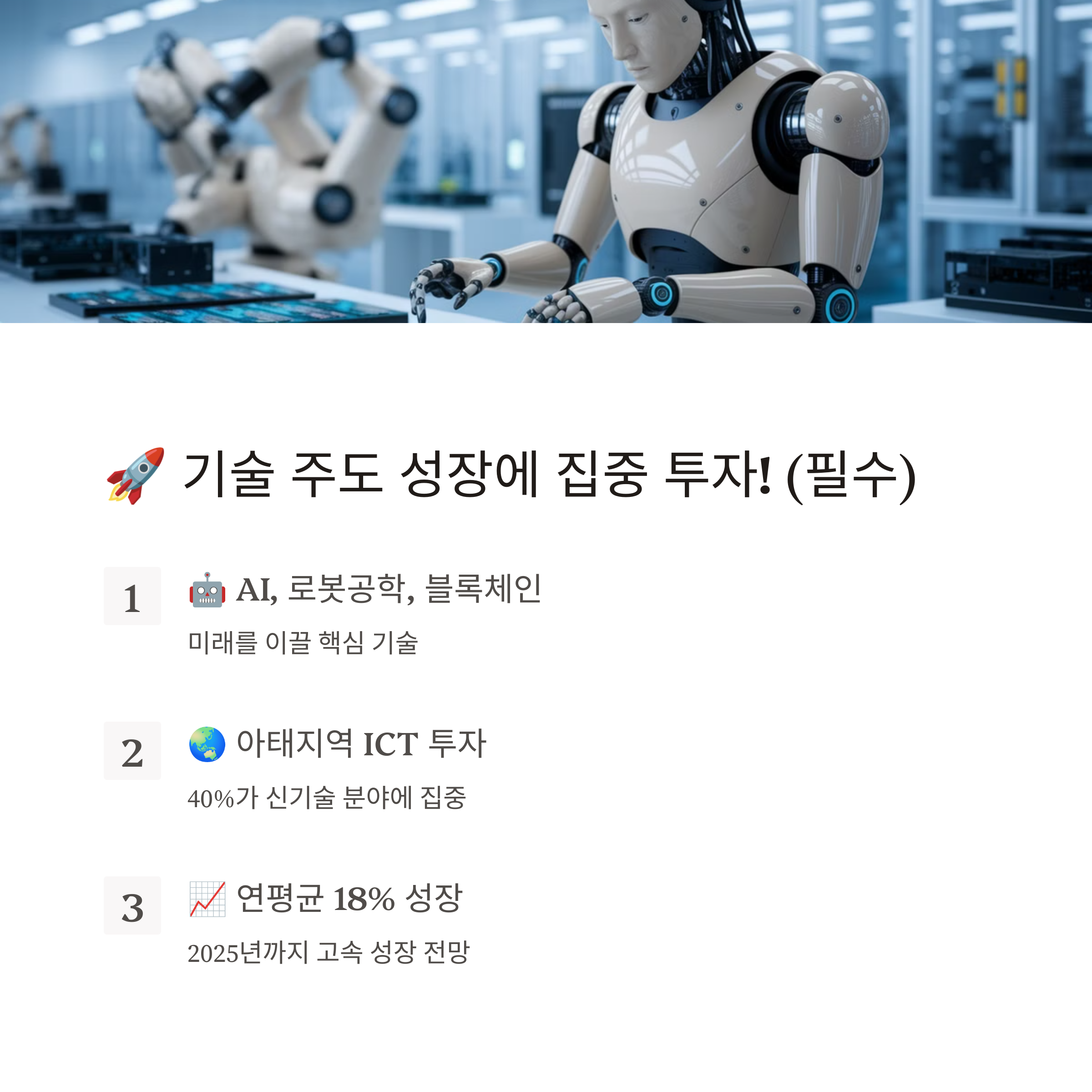| 기술 주도 성장 | AI, 로봇공학, 블록체인 등 신기술 산업 성장 |
