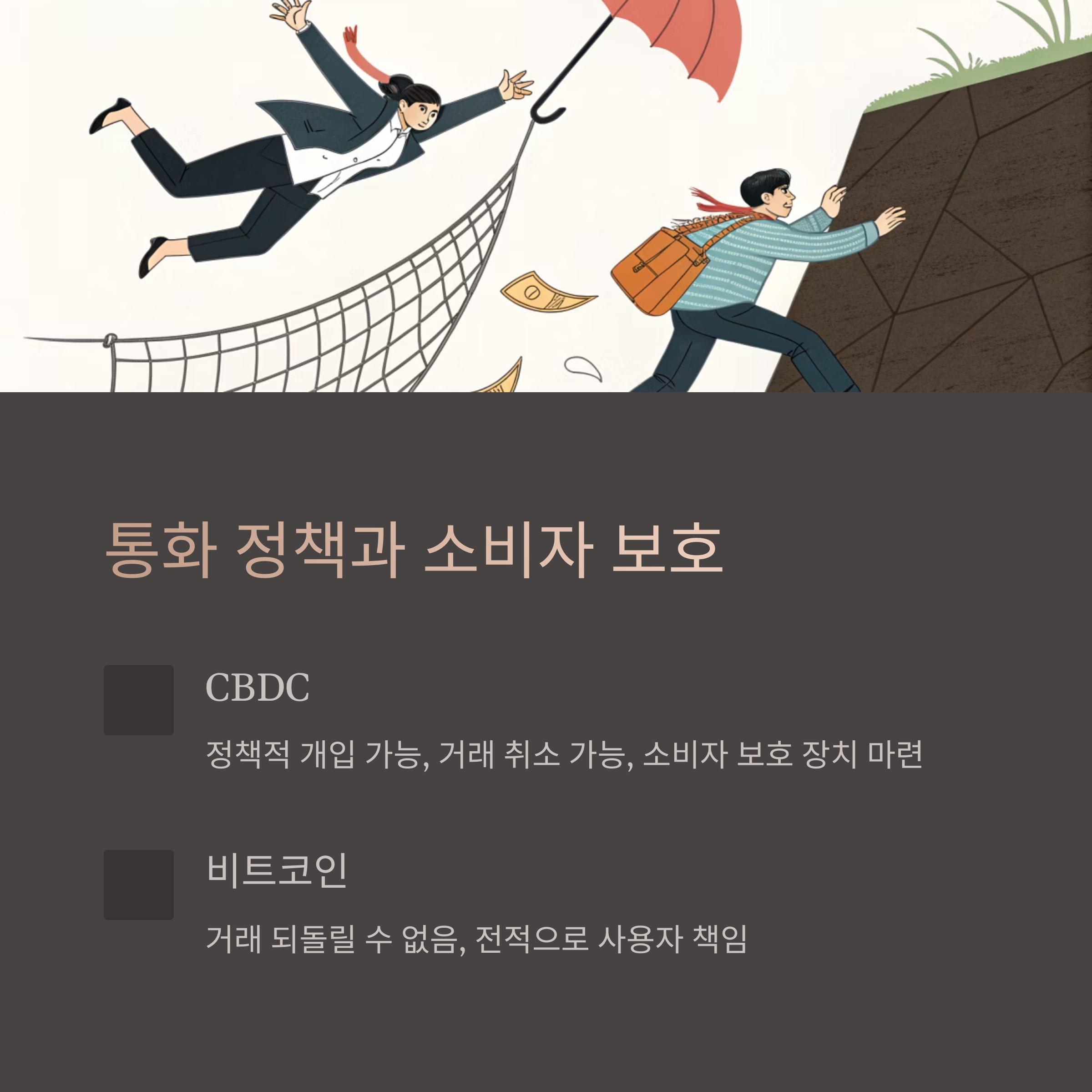 이 점에서 보면 CBDC는 금융 소비자 보호 장치가 잘 마련된 반면, 비트코인은 전적으로 사용자 책임이라는 점에서 부담이 크다고 할 수 있어요.