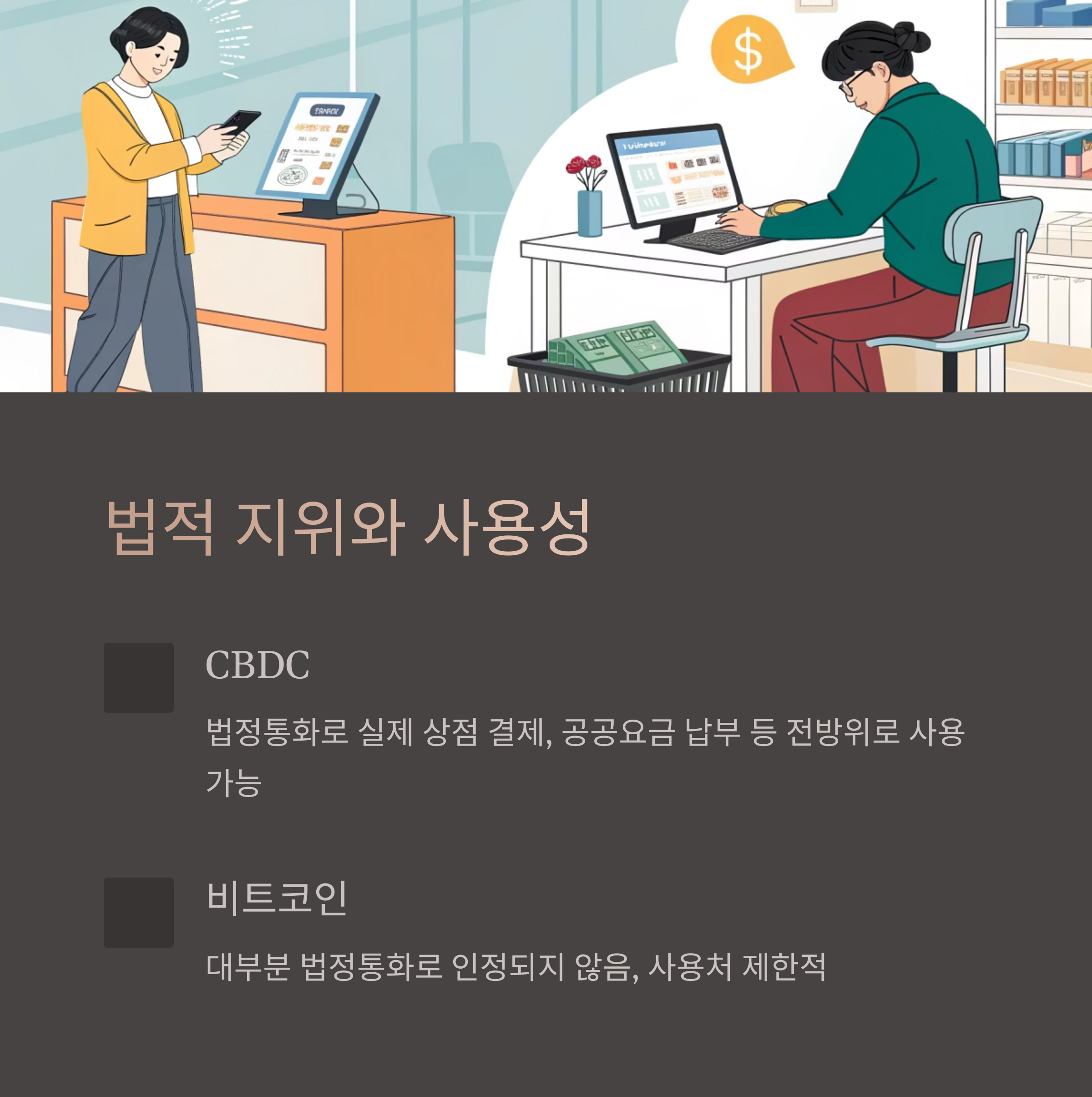 저도 처음엔 그냥 하나는 정부가 만든 디지털 돈이고, 다른 하나는 개인들이 쓰는 코인이라고만 생각했는데... 알고 보면 목적, 기술, 법적 지위까지 다릅니다.